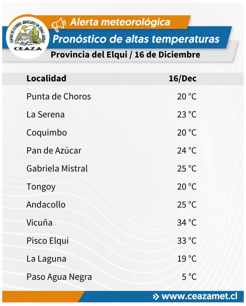 El área meteorológica del Centro Científico CEAZA pronostica temperaturas máximas por sobre lo normal para la época del año durante el día martes 16 de diciembre en valles interiores de la región de Coquimbo.