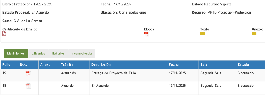Aún así, la demora del tribunal de alzada para levantar el bloqueo del fallo persiste sin razones conocidas, manteniéndose en dicha calidad de “bloqueada” en el sistema del Poder Judicial, como se muestra en la captura de pantalla de este jueves 18 de noviembre.